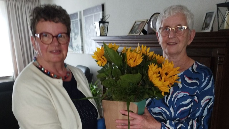 Een van hen was Thea Hafmans. Onze voorzitter Lies Eikelenberg en coördinator bezoekwerk Jan Geurts hebben op zaterdag 7 juni jl. Thea het welverdiende bloemetje overhandigd.